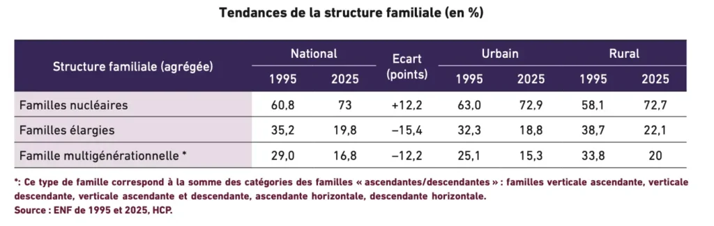 ويشير هذا التحول إلى انتقال تدريجي من الأسرة الممتدة إلى وحدات أصغر، وهو ما ينعكس على طبيعة التضامن العائلي وآليات الدعم بين الأجيال.