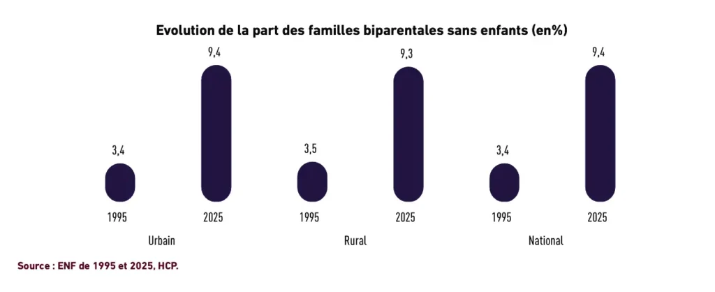 من أبرز المؤشرات الرقمية اللافتة، ارتفاع نسبة الأزواج دون أطفال من 3.4% إلى 9.4% خلال الفترة الممتدة بين 1995 و2025.